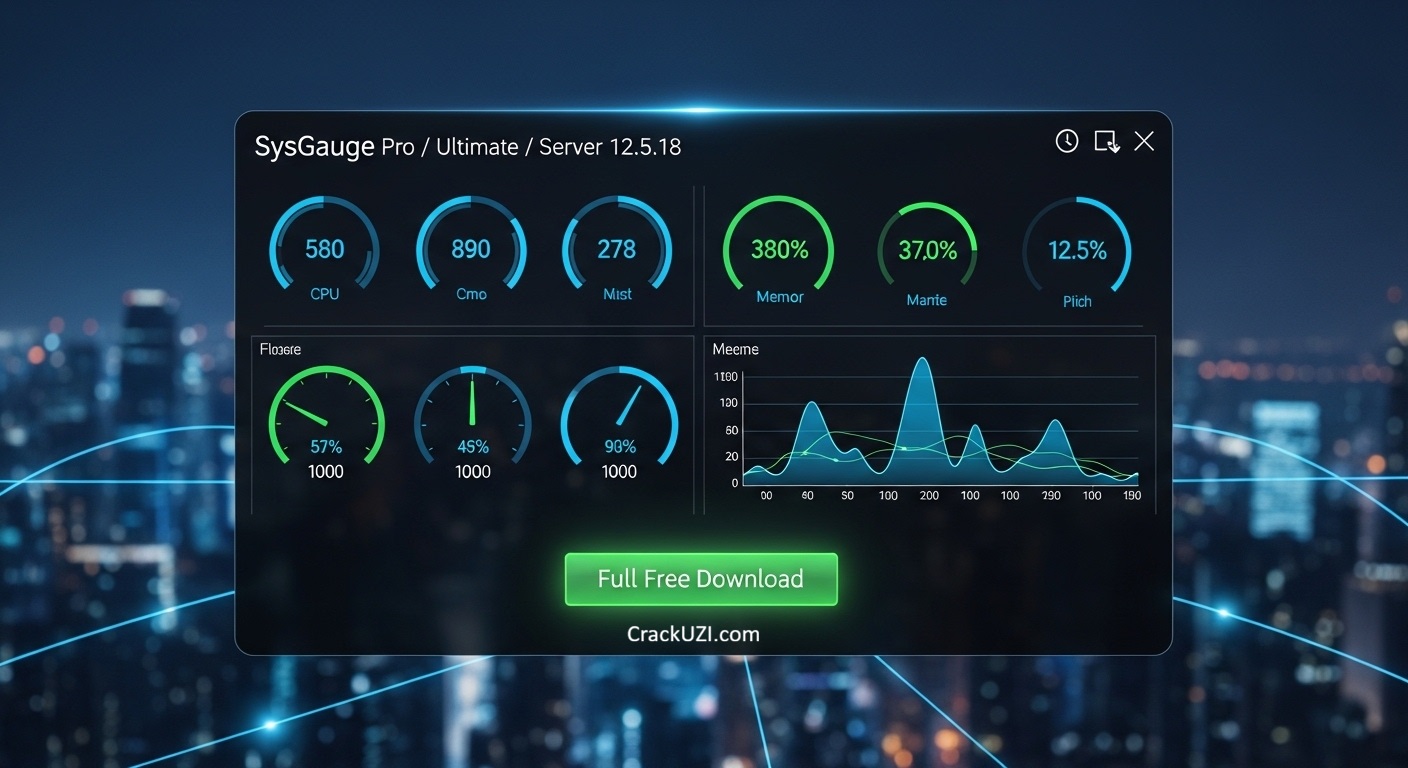 The SysGauge GUI application features a single, customizable main GUI along with multiple dedicated modules designed for specific monitoring tasks, including system status, CPU usage, memory usage, process activity, system analysis, disk performance, NAS server monitoring, and network monitoring.